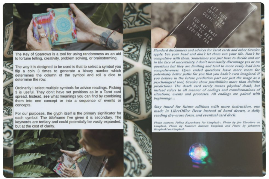 The Key of Sparrows website and glyph based fortune telling or brainstorming schema, graphics and writings © Copyright © Cooper Dozier 2016-2024 ©. Information about various other works and projects of mine may be found at https://linktr.ee/cooperdozier. Background image source: @cedric_photography on Unsplash.com
