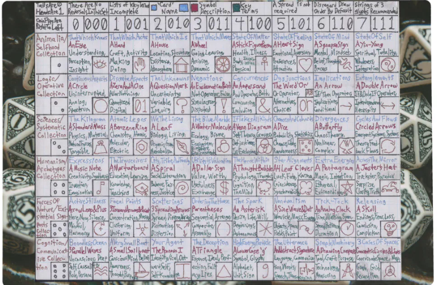This page and site will continue to evolve and be refined. Since I am now sending out postcards with this URL and glyph based 'fortunes' I need to get something online. This is kind of the minimum quality I was willing to expose to the public. There's a bit more to this brainstorming / fortune telling / creativity tool / divination architecture but this is all you need to form your own conclusions or ideas if you want to draw meaning from it. I first began working on a version of this in 2016 and I think it has just about reached its final version, although I intend to eventually refine the designs into a card deck, posters and other more graphically polished items to try to sell, probably through a print on demand service. I have my doubts about whether getting significant inventory manufactured and trying to place it in stores or sell online would produce results worth the investment.